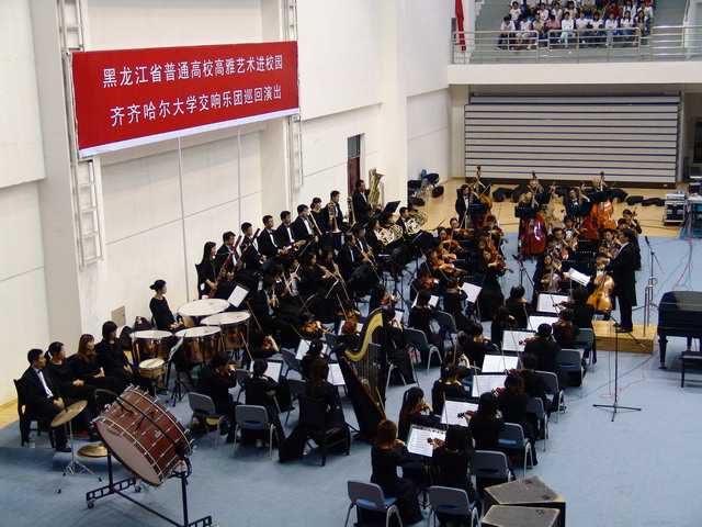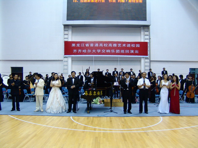6月25日晚,我校交响乐团来到了此次巡回演出的最后一站--黑龙江八一农垦大学,在八一农垦大学的体育馆为4000多名师生在献上一场音乐盛宴。黑龙江八一农垦大学校党委书记翟瑞常、副书记南都国,副校长宋来田、赵福春,工会主席王毅等校领导出席了音乐会。