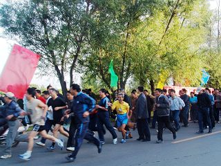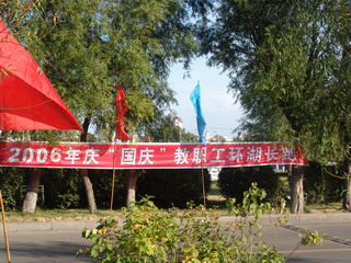 金秋北国,秋高气爽。在我校文化宫前,彩旗飘扬,标语醒目,“2006年庆‘国庆’教职工环湖长跑”的横幅分外鲜明。15时30分,随着校工会主席吕晓辉的发令声起,在学校“前导队”旗帜的引领下,环湖长跑队伍沐浴金色阳光从起点出发,环湖而跑,在湖光秋色中形成了一道亮丽的风景。