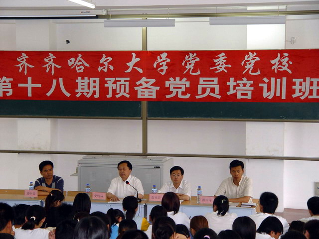 6月7日,我校党委党校举办了第十八期预备党员培训班。 培训班开学式在11教阶梯201教室举行,开学式由党委组织部部长、党委党校常务副校长盖元臣同志主持,大学党委副书记、党委党校校长史铁成同志出席培训班开学式并作了动员讲话。他在动员讲话中强调三点:一是明确培训目的,端正学习态度,增强学习的自觉性。二是要深入系统学习《党章》,增强先进意识,以实际行动加强先进性建设。三是要进一步增强先锋意识,在学校改革、发展、创新中发挥党员的先锋模范作用。