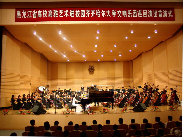 昨晚,齐大音乐厅座无虚席,气氛热烈,1200余名大学生聆听了一场高水平的交响音乐会,省教育厅副厅长高蓓、艺体处处长焦光宇、齐齐哈尔市副市长马立群以及来自香港的友人和省市新闻单位的朋友出席并观看了演出,这标志着我省高校高雅艺术进校园活动拉开了帷幕。
