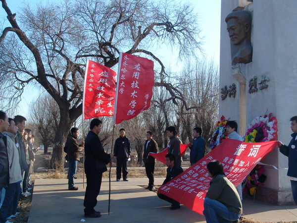 4月5日,清明节的当日早晨。我校经济管理学院、人文学院、应用技术学院、齐大青年报等单位青年学生在党团组织的带领下,有秩序地到和平广场和沙涛革命烈士纪念碑祭奠扫墓,并分别举行了庄严的入党宣誓仪式。