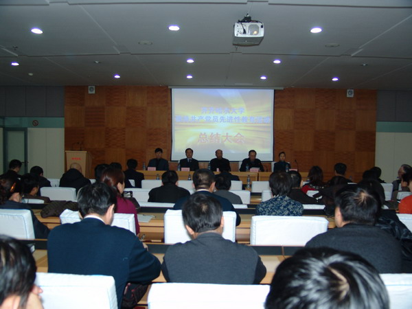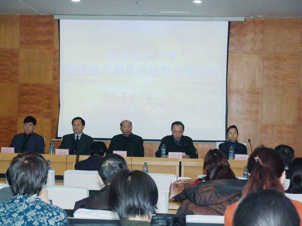 2005年12月21日下午4:00,我校在西区主楼报告厅隆重召开了“保持共产党员先进性教育活动”总结大会,校党委副书记、校长唱江华,党委副书记史铁成、王凤琴,党委常委、纪委书记张学军,副校长姜守训、张忠恒,工会主席吕晓辉,市委第六督导组组长龙志远及其成员出席了大会,各基层党委(党总支、直属党支部)书记、正处级干部、处级单位主持工作的副职,副处级单位主要负责人,校先进办成员和指导组成员,各单位先进办主任、党支部书记及民主党派负责人等参加了会议,校党委副书记史铁成主持了大会。