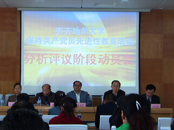 10月11日,校党委在西区学术报告厅召开了全校保持共产党员先进性教育活动分析评议阶段动员大会,校党委书记陈承贵、校长唱江华、党委副书记史铁成、王凤琴、副校长姜守训、张忠恒、郑喜群、邓启刚、工会主席吕晓辉以及市委督导组成员出席了会议,校先进性教育活动领导小组办公室成员及各基层党组织先进性教育活动领导小组组长、领导小组办公室主任参加了会议,会议由校长唱江华主持。