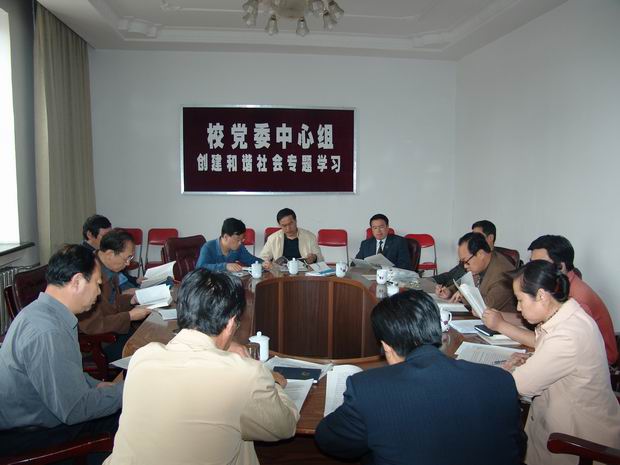 构建社会主义和谐社会是以胡锦涛同志为总书记的党中央从全面建设小康社会、开创中国特色社会主义事业新局面的全局出发提出的一项重大战略任务,也是一个重要的理论创新。为了及时跟进、深刻领会我们党理论创新的最新成果,更好地做好构建社会主义和谐社会的各项工作,5月25日下午,我校党委理论学习中心组在机关二楼会议室召开构建社会主义和谐社会专题学习会议。校党委书记陈承贵主持会议并发表了重要讲话。校长唱江华、党委副书记王凤琴、副校长曲伟健、姜守训、张忠恒、郑喜群、邓启刚、工会主席吕晓辉出席了学习会。中心组成员单位组织部长盖元臣、学工部长王刚、党办主任尹欧、宣传部副部长田志峰参加了此次学习。