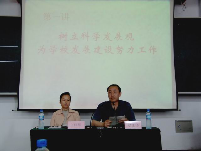 6月8日下午,我校处级干部培训班在主楼J203室开班。校长唱江华代表学校党委作动员讲话,并作了题为“树立科学发展观,为学校发展建设努力工作”的第一讲讲座。学校党委副书记王凤琴主持了开班式及讲座,学校全体现职副处级以上干部参加了培训。