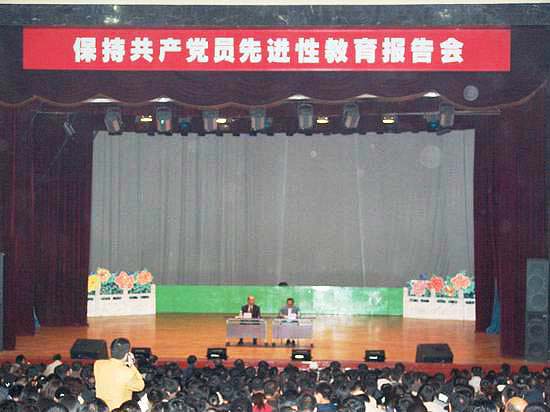 根据我校《保持共产党员先进性教育活动集中学习教育实施方案》安排,9月21日下午,在中区俱乐部召开全校党员大会,集中听取市委保持共产党员先进性教育督导组组长龙志远作的《全面深入学习“三个代表”重要思想,做实践“三个代表”的模范》专题报告。校党委书记陈承贵、校长唱江华、党委副书记史铁成、王凤琴、纪委书记张学军、副校长曲伟建、姜守训、张忠恒、郑喜群、邓启刚、工会主席吕晓辉以及市委保持共产党员先进性教育督导组成员出席了大会,全校教工、学生和离退休党员参加了大会。会议由校党委书记陈承贵主持。