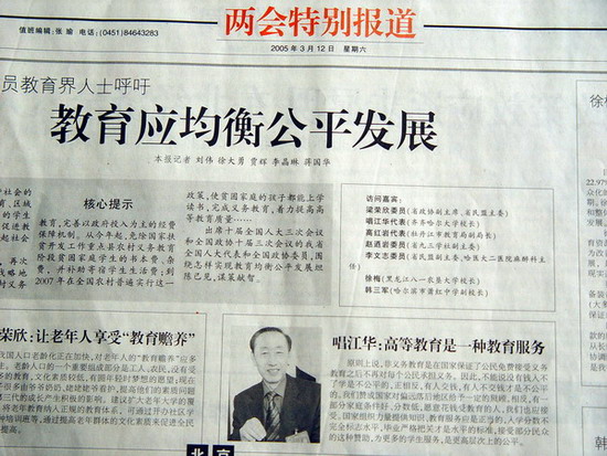 围绕怎样实现教育均衡公平发展问题,唱江华校长提出“高等教育是一种教育服务”的建议。3月12日的《黑龙江日报》以《我省代表委员及教育界人士呼吁教育应均衡公平发展》为题作了报道。