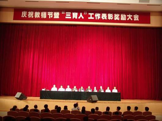 校党委书记陈承贵主持了大会。会议开始时,全体起立,奏国歌;整个会场庄重热烈,洋溢着节日的气氛。 校党委副书记史铁成宣读了学校党委《关于命名表彰“三育人”标兵 先进个人和先进集体的决定》。人文学院等7个单位荣获了“三育人”先进集体;贾丽华等6人荣获了“三育人”标兵;赵家林等94人荣获“三育人”先进个人。学校领导为获奖集体和个人代表颁了奖。学生代表、校学生会主席王杨同学代表全体在校生向全体教师表达了节日的祝福,发出了广大莘莘学子对人民教师无限尊敬的心声。“三育人”标兵代表,轻纺学院刘铁山副教授代表全体教师发言,感谢党和国家及学校对教师的关怀和鼓励,表达了全体教师用“爱与责任”铸“师德之魂”的节日感言。
