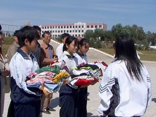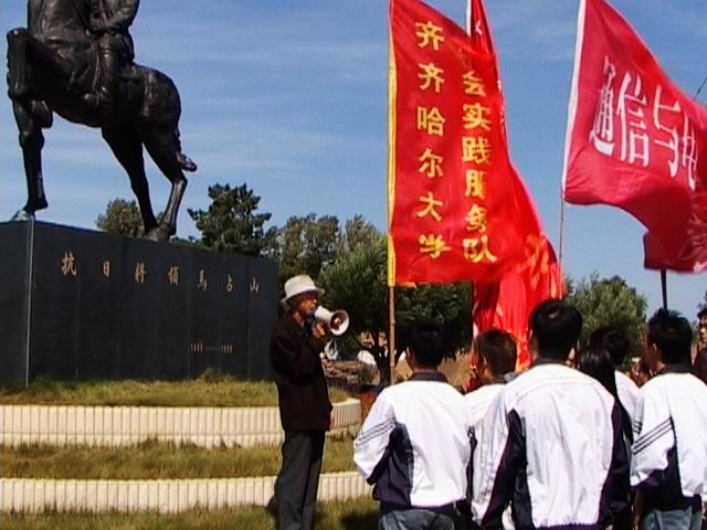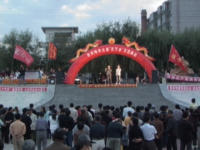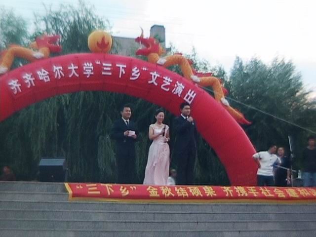 9月5日上午,社会实践服务团师生不顾一路颠簸劳累,在到达泰来县江桥镇后即在江桥镇马占山抗日纪念公园举行了“缅怀先烈,牢记历史”爱国主义主题教育活动,听取了王东升老同志的关于江桥抗战革命历史知识介绍。齐齐哈尔市关工委副主任崔文杰、察广信、甘文耀,泰来县县委副书记郭宇航、副县长马志海、团县委书记刘立伟、江桥镇镇长李洪宇等出席活动;同时,社会服务团资助了泰来县江桥镇中学5名贫困学生,为江桥镇捐赠衣物600余件;开展了义诊并赠送药品。晚18:30,社会实践服务团师生在泰来县中心广场开展“再携手,共建和谐”大型广场文艺演出。泰来县委、县人大、县政府、县政协及相关部门领导和社会各界群众千余人观看了精彩的文艺演出。我校大学生社会实践服务团成员与泰来县群众一起同台表演,活跃了气氛,增进了友谊。我校学生表演的歌曲《跟党走》、舞蹈《月光下的凤尾竹》等精彩的文艺节目博得了现场的泰来县广大人民群众的热烈掌声。热情洋溢的掌声,进一步激发了广大同学更好地开展“三下乡”活动的信心;人民群众的鼓励,更加坚定了同学们践行“三个代表”重要思想的决心。