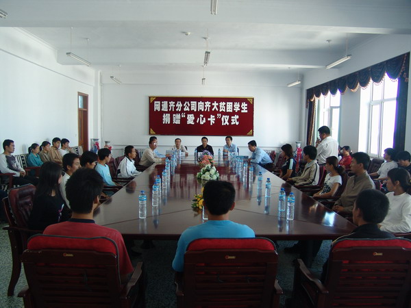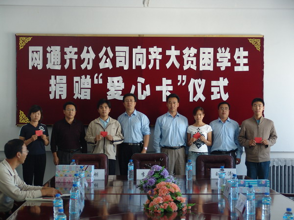 9月14日下午1时,中国网通齐齐哈尔分公司向贫困学生捐赠"爱心卡"的仪式在我校西区主楼606会议室举行。齐齐哈尔通信分公司副总经理李岩、齐齐哈尔通信分公司浏园分局局长刘松涛、副局长高宏伟、闫伟,我校学生处处长王刚、副处长吴宝柱及相关工作人员与来自各学院的30名贫困生代表参加了仪式。