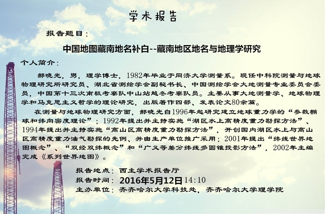 5月12日,郝晓光研究员在西区主楼学术报告厅举行了题为《中国地图藏南地名补白藏南地区地名与地理学研究》的学术报告。