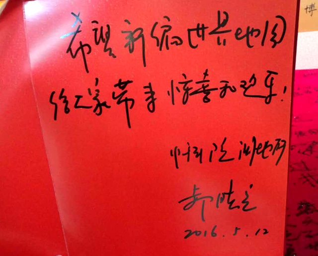 在校讲学期间,郝晓光、王阳一行还参观了我校校史馆和美丽的环湖校园。郝晓光博士还在校史馆留言簿寄语:“希望新编世界地图给大家带来惊喜和欢乐!”