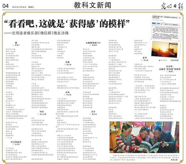 “齐齐哈尔大学首届丁香节——丁香诗会”上朗诵的诗歌,大部分来自于《光明日报》所举办的“诗意 故乡”活动征稿,都是我校师生的原创作品。我校师生在光明日报所举办的征稿活动中踊跃投稿,佳作不断,校党委书记李海红所作的 《看看吧,这就是获得感的模样》还被作为通栏标题刊登在2月28日出版的光明日报第四版上。