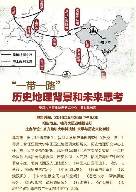 葛剑雄教授在讲座中指出,由于自然地理环境的局限和古代中国独特的社会历史发展境遇,我国古代开通和维护丝绸之路的动力主要来自外界。21世纪中国的“一带一路”战略不是古代丝绸之路的再现或重建,也不是“新马歇尔计划”,而是前无古人的伟大创举。