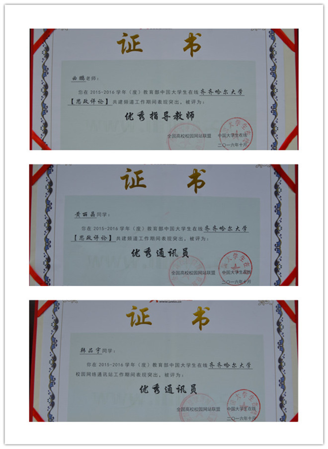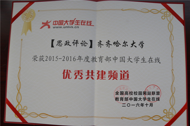 我校与教育部中国大学生在线共建的“思政评论”频道荣获“2015-2016年度教育部中国大学生在线优秀共建频道”,这是我校连续六年获此殊荣,先后共有三名同志荣获“中国大学生在线共建频道优秀指导教师”称号,多名学生获得“思政评论”频道及校园网络通讯站“优秀通讯员”称号。