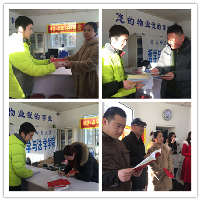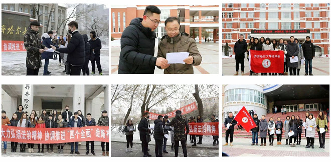 12月4日中午,齐齐哈尔大学法学会的同学在学校中区、东区校门口、人文楼、食堂等处进行了现场法治宣传活动,向过往的师生发放宪法等法律知识宣传单,并向一些老师、同学提供了法律咨询服务,受到现场师生的好评。