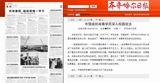 5月24日,在国际禁毒日宣传月到来之际,齐齐哈尔大学、齐齐哈尔市司法局、齐齐哈尔市强制隔离戒毒所在我校西区学术报告厅联合组织了“青春起航 法伴成长”戒毒人员现身说法报告会。齐齐哈尔市强制隔离戒毒所副所长姚旭明,市强制隔离戒毒所助理调研员矫仁东,市司法局法制宣传处处长庄体勇,我校党委宣传统战部副部长何强及200余名学生参加了报告会,何强主持了报告会。报告会以三名戒毒人员的亲身经历和一线干警的工作实践,告诫大学生们珍爱生命、远离毒品,做尊法学法守法用法的典范,刻苦学习,健康成长,报效祖国,奉献社会。并向戒毒人员赠送了书籍。学生们表示,通过这次报告会更加充分认识到毒品的危害,今后将进一步提高禁毒意识和拒毒能力,从我做起,从现在做起,珍惜生命,远离毒品,参与禁毒斗争,为创建文明校园作出新的贡献。《齐齐哈尔日报》、《鹤城晚报》、齐齐哈尔电视台等市级主要媒体做了热忱报道。
