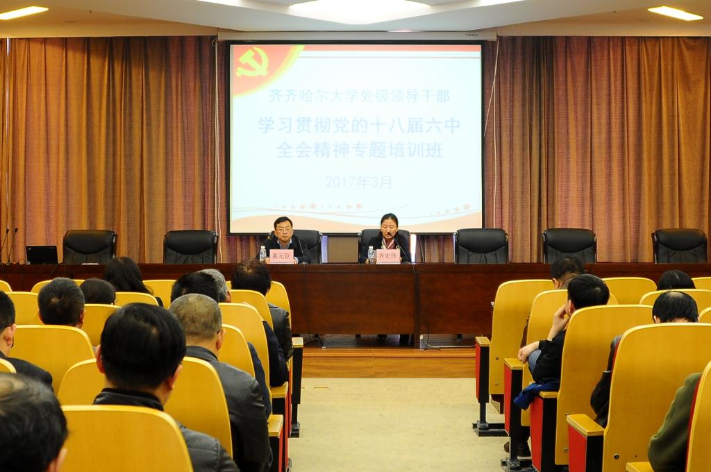 为深入学习贯彻习近平总书记在党的十八届六中全会和省部级主要干部专题研讨班上的重要讲话精神,以及省委书记王宪魁在全省高校思想政治工作会议上的讲话精神,贯彻落实《准则》《条例》,进一步落实党建主体责任,增强领导干部“四个意识”特别是政治意识和看齐意识,旗帜鲜明讲政治。3月31日上午,我校在德润大厦四楼会议室举办全校处级领导干部学习贯彻党的十八届六中全会精神专题培训班。培训班由校党委副书记齐宏伟主持。