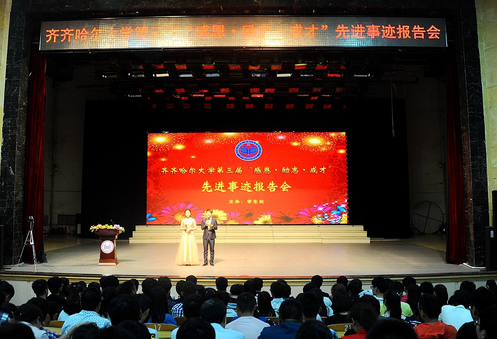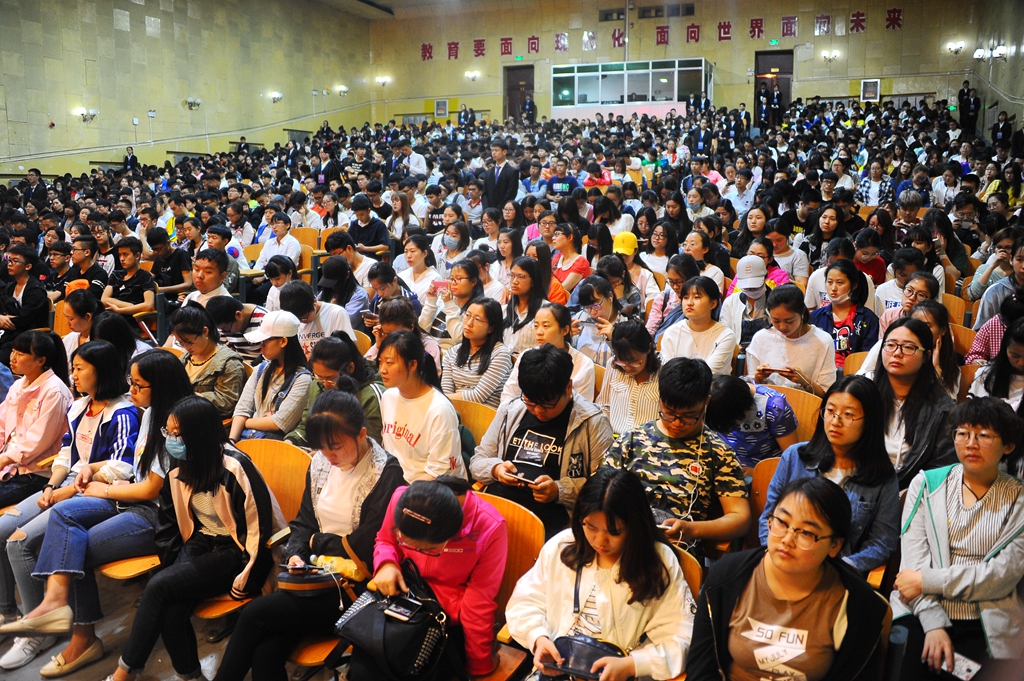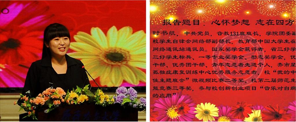 5月19日18时30分,报告团首场报告会在中区文化宫举行。常务副校长郑喜群出席了报告会,学生工作部(学生处)部(处)长姜波、副部(处)长张树启、学生工作部(学生处)各科室工作人员及来自全校10个学院共1300余名学生参加了首场报告会。先进事迹报告团中化学与化学工程学院王书晴、通信与电子工程学院佐姗姗、理学院肖利丹、音乐与舞蹈学院时书航、文学与历史文化学院李睿共五名同学与大家分享了他们的成长经历。