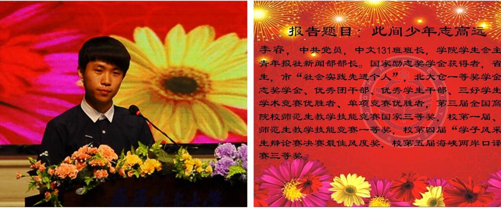 为展现我校优秀学子风采,引领校园文化方向,激励同学们勤奋学习,积极进取,感恩励志,学校开展了第三届“感恩•励志•成才”先进事迹报告团巡讲活动。学生工作部(学生处)精心组织,经过各学院选拔、推荐,学校考察、初选、复选等程序,化学与化学工程学院王书晴等10名同学成为我校“感恩•励志•成才”先进事迹报告团成员。