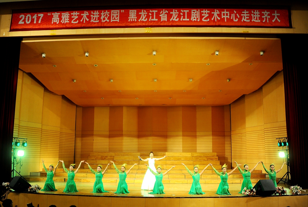 6月6日下午,2017“高雅艺术进校园”——黑龙江省龙江剧艺术中心走进齐大专场文艺演出在我校音乐厅举行。在中心党委书记、主任杨晓全的带领下,该中心的40余名演职人员用他们的精湛技艺为我校师生送来了一场高水平的艺术盛宴。我校党委副书记盖元臣,党委副书记齐宏伟,纪委书记姜国庆,党委宣传统战部部长王晓梅,学生工作部(学生处)部(处)长姜波,党委宣传统战部副部长孟宪国、何强,音乐与舞蹈学院党政班子和1000余名师生共同欣赏了演出。