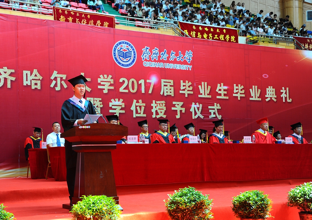 本科生代表、校学生会主席、校优秀毕业生纪铖同学发言。他代表2017届毕业生向辛勤培育他们的母校、向关心呵护他们的领导和老师表示深深的感谢和崇高的敬意!向辛勤养育他们的父母表达最真挚的祝福。向四年来一起朝夕相处的兄弟姐妹们,表达最真诚的的问候。大家将告别朝夕相处的同学,作别循循善诱的老师,离开美丽如画的校园,踏上人生新的征程。但永远不会舍弃在齐齐哈尔大学学到的点点滴滴,永远不会忘记在迷茫彷徨时老师的悉心指点,永远不会忘记在伤心难过时同学的真切问候。同学们会带着那份对社会的责任、带着母校的期盼、带着父母的祝福、带着朋友的鼓励,奔赴到各个工作岗位上,成长为一名自强不息,敢于担当,乐于奉献的齐大人。最后再次祝福母校人才辈出,桃李芬芳;祝福恩师工作顺利,万事如意;祝福父母身体康健,阖家幸福;祝愿齐齐哈尔大学2017届全体毕业生前程似锦,一帆风顺!