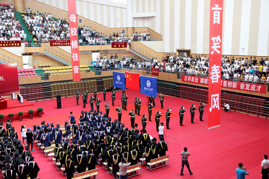 齐齐哈尔大学2017届毕业生毕业典礼暨学位授予仪式举行了隆重的升旗仪式。学校国旗班同学戎装出旗,步履铿锵。全体起立,面向国旗行注目礼,升国旗、升校旗,唱国歌。