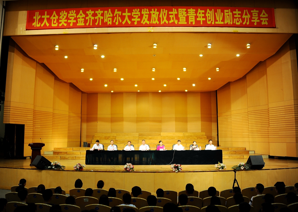 6月28日下午,北大仓奖学金齐齐哈尔大学发放仪式暨青年创业励志分享会在我校音乐厅隆重召开。北大仓集团有限公司总经理隋熙凤,我校校长马立群、党委副书记盖元臣、常务副校长郑喜群,团市委书记郑德利、副书记孙玲玲,北大仓集团有限公司总经理助理高利军出席会议,我校北大仓奖学金获得者及各学院师生代表750人参会。仪式由学生工作部(学生处)部(处)长姜波主持。