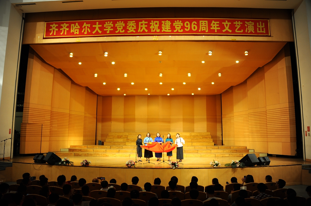 庆祝建党96周年文艺演出由齐齐哈尔大学党委主办、音乐与舞蹈学院党委承办,音乐与舞蹈学院师生共编排了13个优秀的民乐及民歌节目。