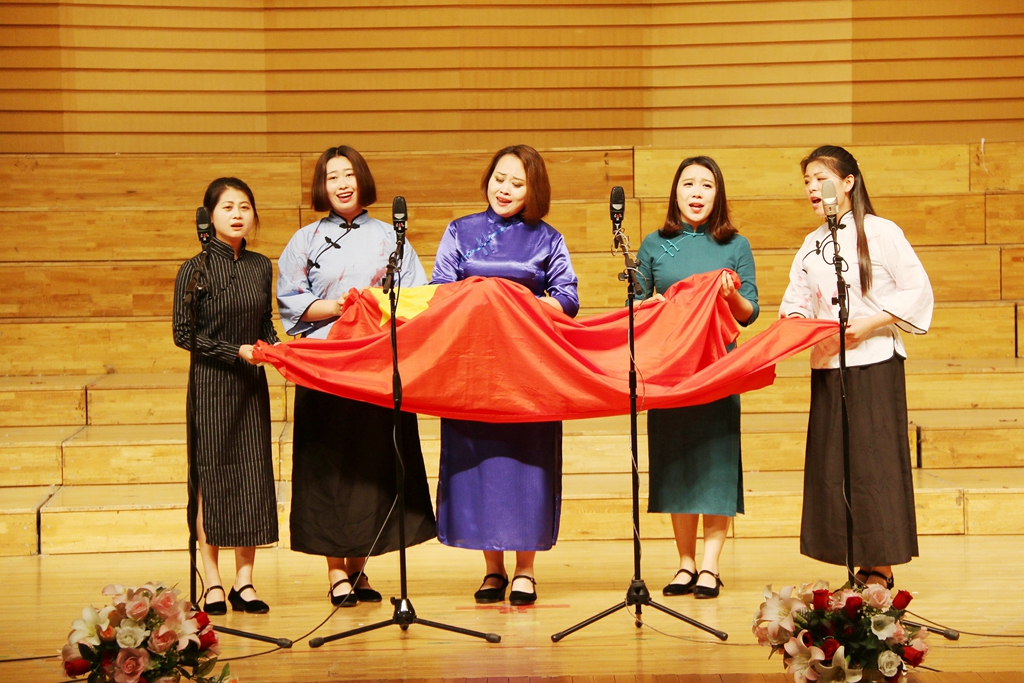 伴随着由音乐与舞蹈学院师生带来的歌剧选段《绣红旗》,庆祝建党96周年文艺汇演拉开了帷幕。男声四重唱《共青团员之歌》用熟悉的旋律瞬间点燃了全场的热情;配乐诗朗诵《黄河之水天上来》,热情歌颂了中国人民坚强不屈的斗争精神,广阔地展现了抗日战争的壮丽图景;群舞《小城雨巷》和《女儿花》用欢快的步伐舞动青春的旋律;男生独唱《把一切献给党》、女生独唱《妈妈教我一支歌》等经典歌曲的演唱,赢得了在场观众的阵阵掌声;唢呐竹笛二重奏《长白山歌》展示了在党的领导下,各族人民心连心、手牵手,军民团结,同呼吸、共命运,共创美好未来的愿景;女声独唱《曙色》、男女声二重唱《阳光路上》、快板《风雨华夏,党谱新篇》、女声独唱《共筑中国梦》等节目,抒发了人民热爱党、歌颂党、祝福党的真挚情感,讴歌了中国共产党人为了祖国和人民出生入死、浴血奋战、开拓进取、甘于奉献的崇高品质,表达了对党无限忠诚、永远跟随党的决心和信心。