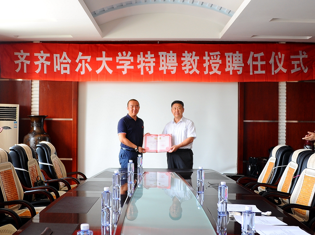 仪式上,校长马立群代表学校向牟克颁发了齐齐哈尔大学特聘教授聘书。