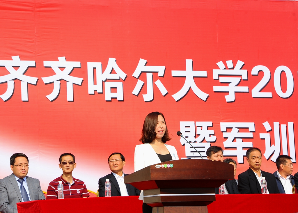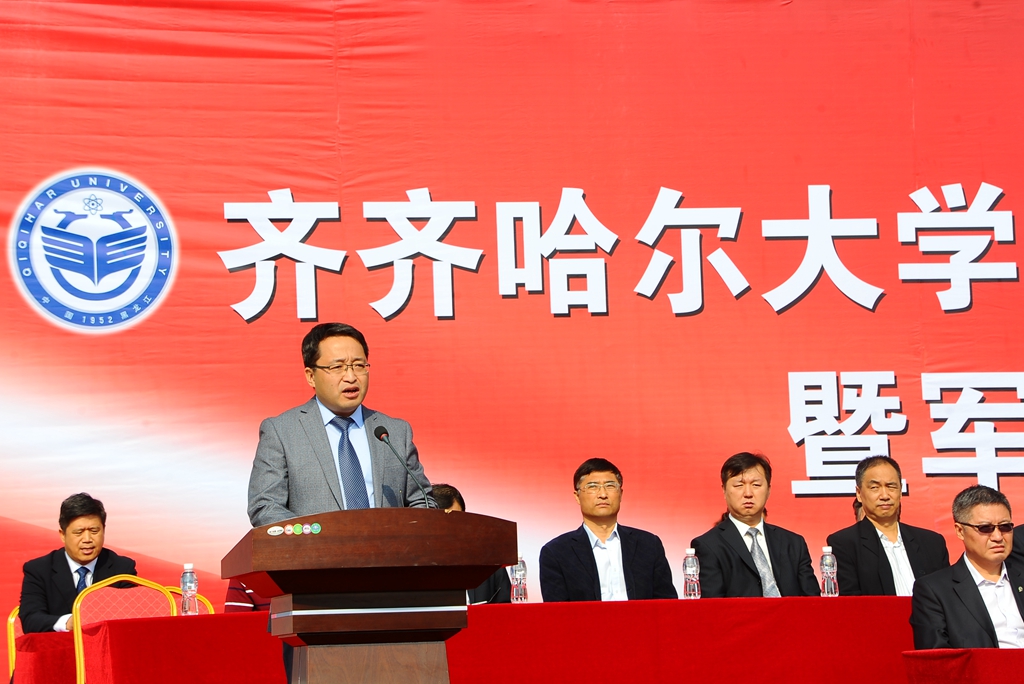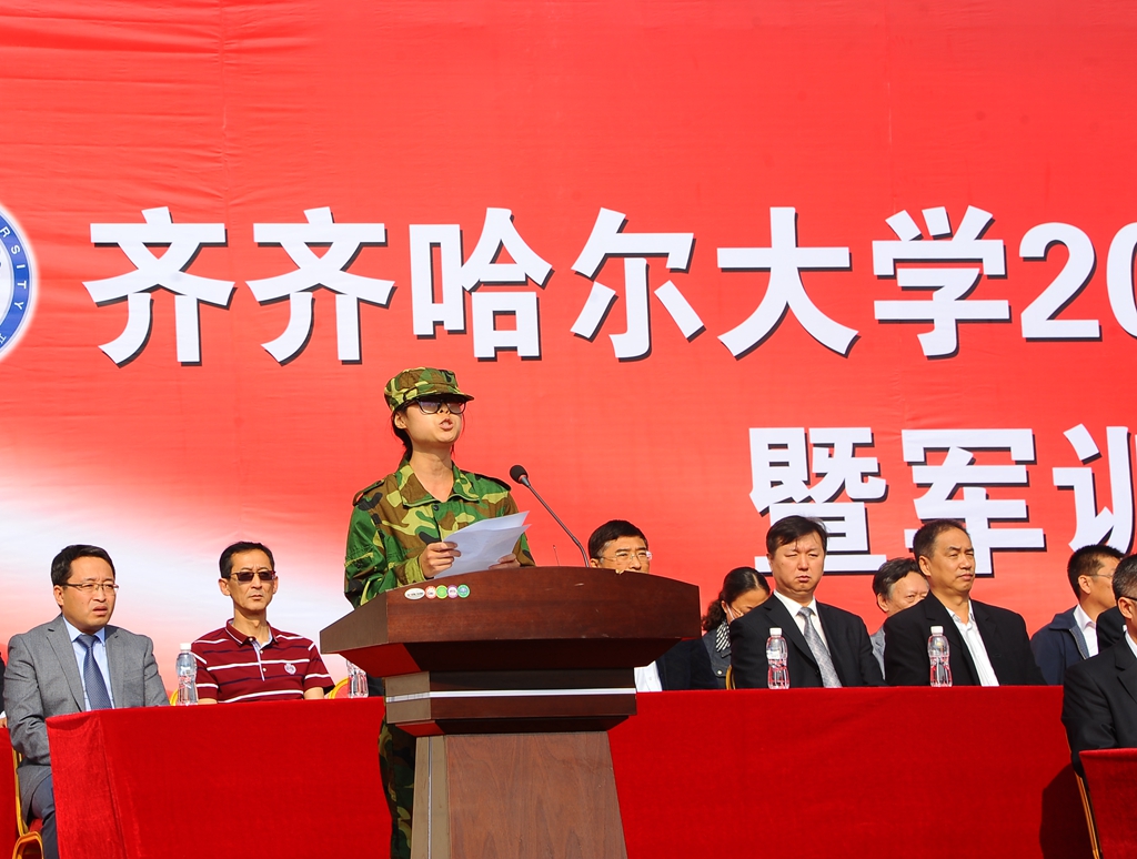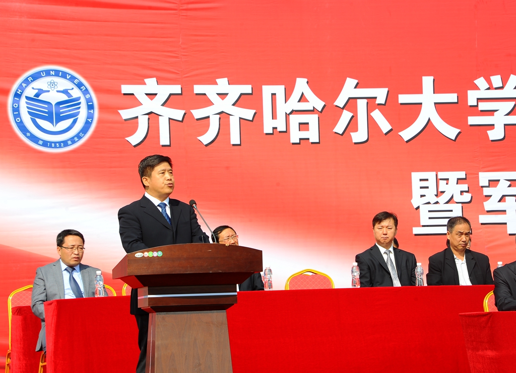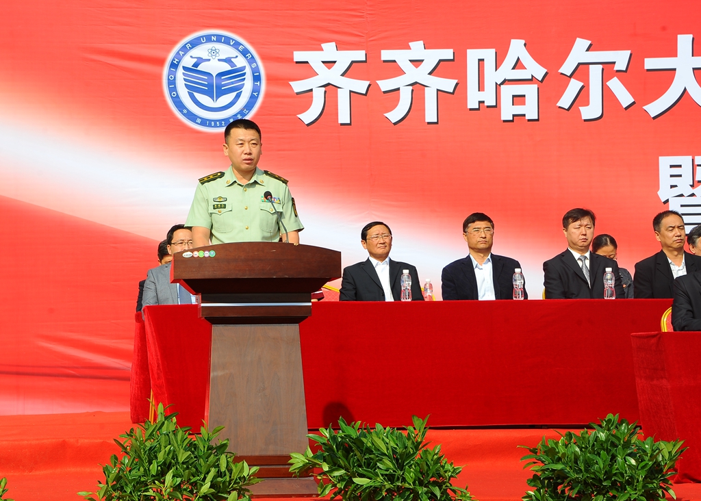 武警齐齐哈尔支队副参谋长韩剑飞中校代表武警齐齐哈尔支队的全体官兵对参加军训工作的老师、学生以及全体教官表示亲切的问候!他表示,齐齐哈尔大学和武警齐齐哈尔支队是共建单位。几年来,我们亲眼见证了齐齐哈尔大学辉煌的建设成就。齐齐哈尔大学举行这次军训,是全面贯彻党的教育方针和国防教育法、推进素质教育的重要举措,是同学们学习军队优良传统、培养艰苦奋斗精神的良好机会,希望同学们一定要珍惜军训机会,高标准、高质量、安全顺利地完成军训任务,超越自我,不断前进,让青春年华在未来的征途中放射出灿烂夺目的光彩!