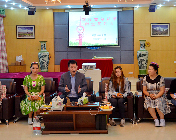 校党委书记兰景力首先询问了来自新疆维吾尔自治区的11名同学生活、饮食情况,并代表学校欢迎新疆少数民族同学们来到齐大学习生活,向他们致以节日的问候。他结合自己四年的援疆工作和生活经历,向与会老师、同学介绍了新疆少数民族的风土人情。