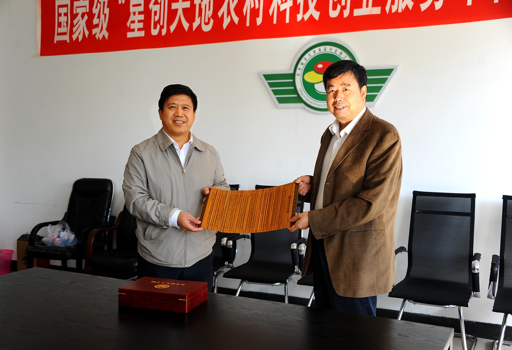 洽谈会结束后,常务副校长郑喜群代表学校向徐明岗赠送了《齐齐哈尔大学赋》竹简。