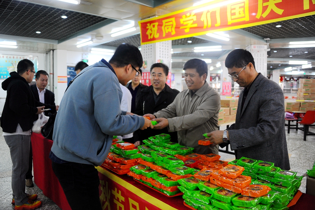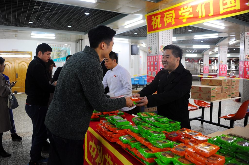 受校党委书记兰景力、校长马立群委托,副校长郑喜群和学生工作部(学生处)部(处)长姜波、后勤管理处副处长杨庆忠等部门负责人一起,来到食堂亲切慰问假期没有回家的同学,向同学们发放了月饼,并将学校的祝福和问候带给了假期留校的各位同学,与大家一起共度中秋佳节。