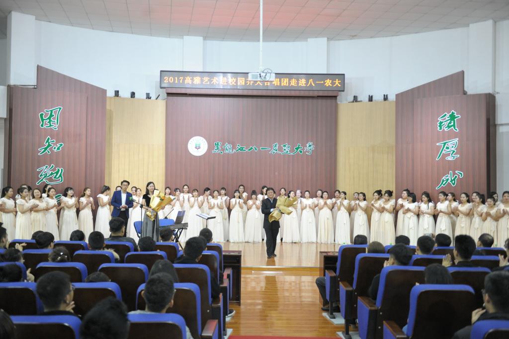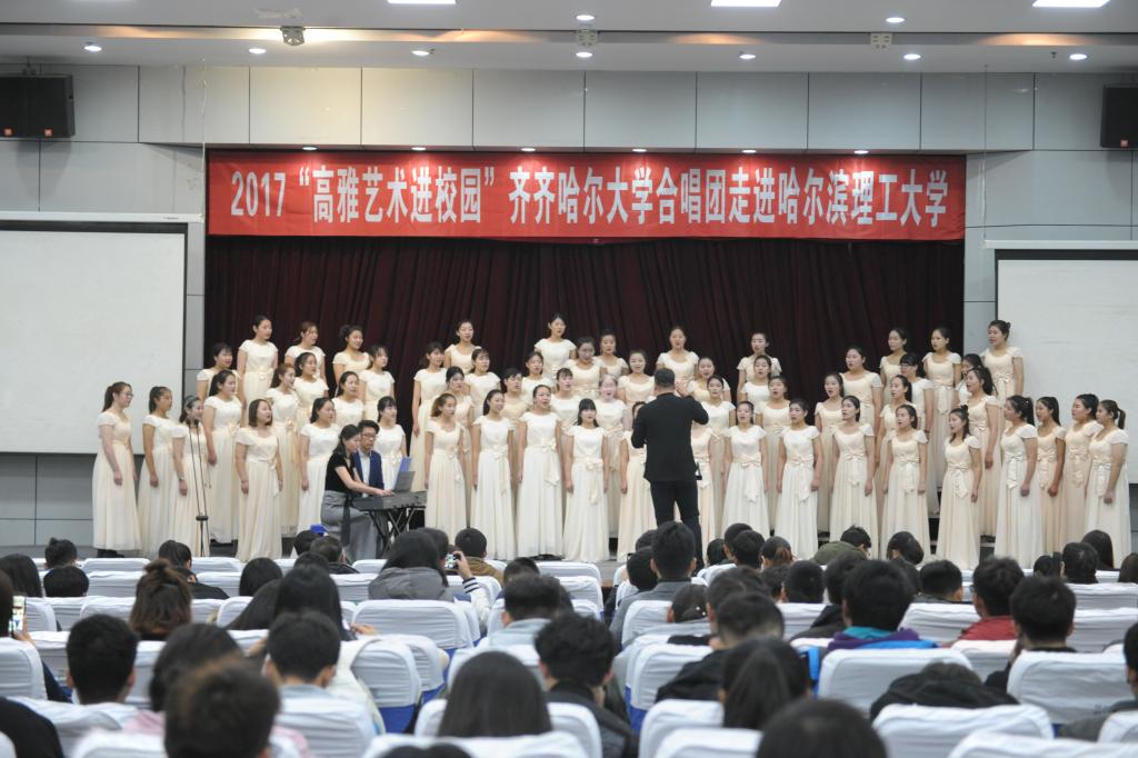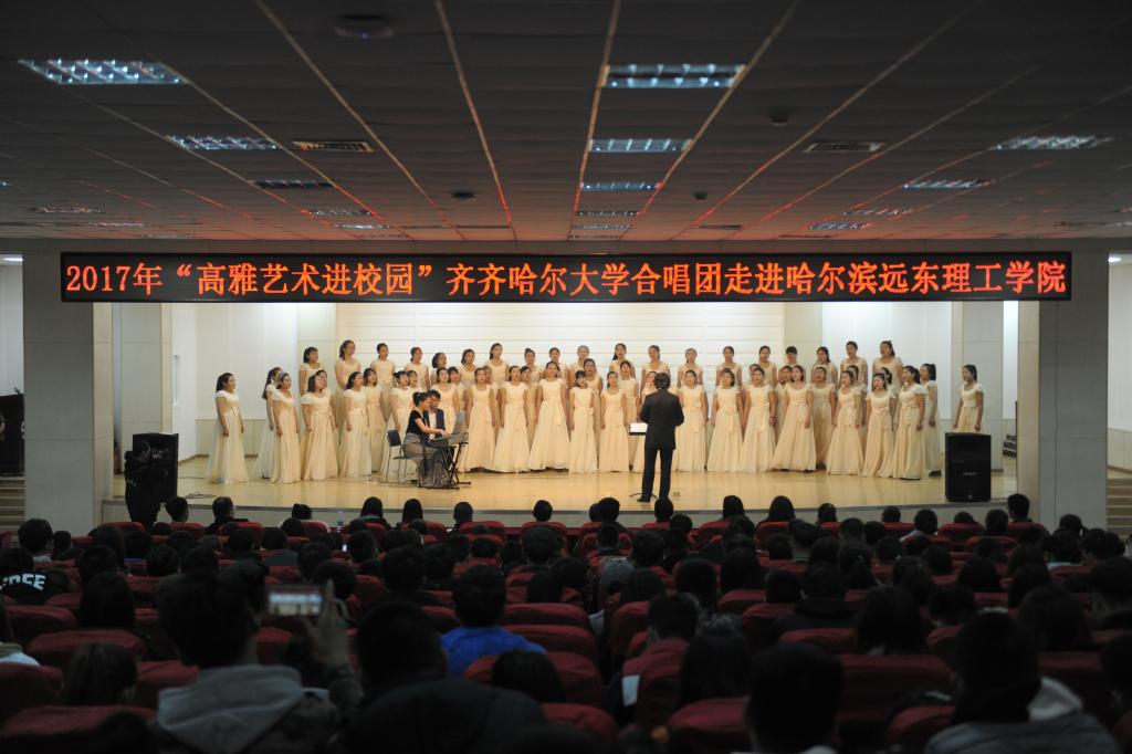 在中国共产党第十九次全国代表大会召开之际,为传承和弘扬高雅艺术,10月20—23日,受黑龙江省教育厅、文化厅、财政厅的指派,齐齐哈尔大学音乐与舞蹈学院院长孙相根,校党委宣传统战部副部长何强,音乐与舞蹈学院管弦系主任郭旭,带领齐齐哈尔大学合唱团70余名师生,赴哈尔滨远东理工学院、哈尔滨理工大学、大庆医学高等专科学校、黑龙江八一农垦大学、大庆职业学院开展了五场“高雅艺术进校园”专场演出。