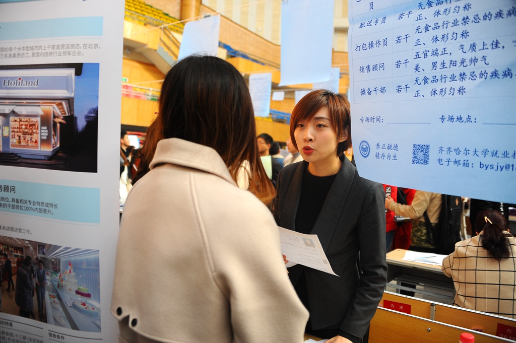 我校以“充分了解就业趋势和用人单位需求,把握就业市场和学生就业方向,深化人才培养和教育模式改革”为核心,诚邀全国各地用人单位云集齐齐哈尔大学招贤纳士。以京、津、浙、沪等地为主的用人单位纷至沓来,包括中煤第七十一工程处有限责任公司、青岛三利集团、哈尔滨轴承集团、中国人寿保险股份有限公司等国有企业,玖龙纸业有限公司、长城汽车股份有限公司、新疆和山巨力化工有限公司、浙江报喜鸟服饰有限公司、中控智慧、青岛啤酒股份公司、百胜餐饮、苏宁云商集团股份有限公司、吉林省东北袜业纺织工业园发展有限公司等知名企业。