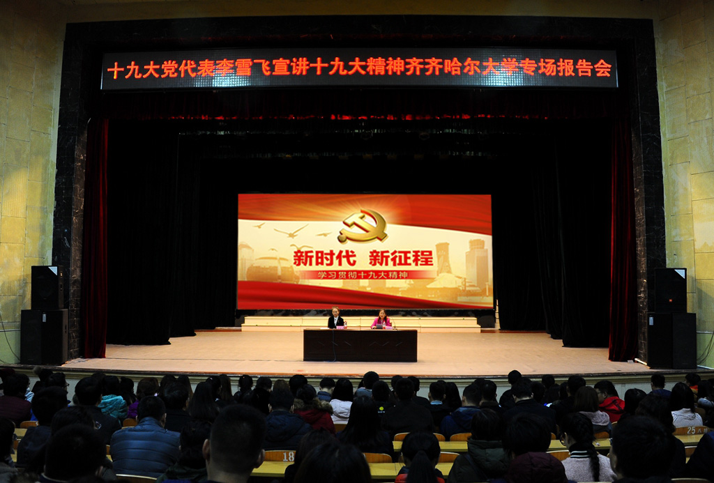 11月11日,我校在中区文化宫召开“党的十九大代表李雪飞宣讲十九大精神齐齐哈尔大学专场报告会”,党的十九大代表、黑龙江省龙江剧艺术中心副主任李雪飞来到我校为师生做十九大精神专题报告。