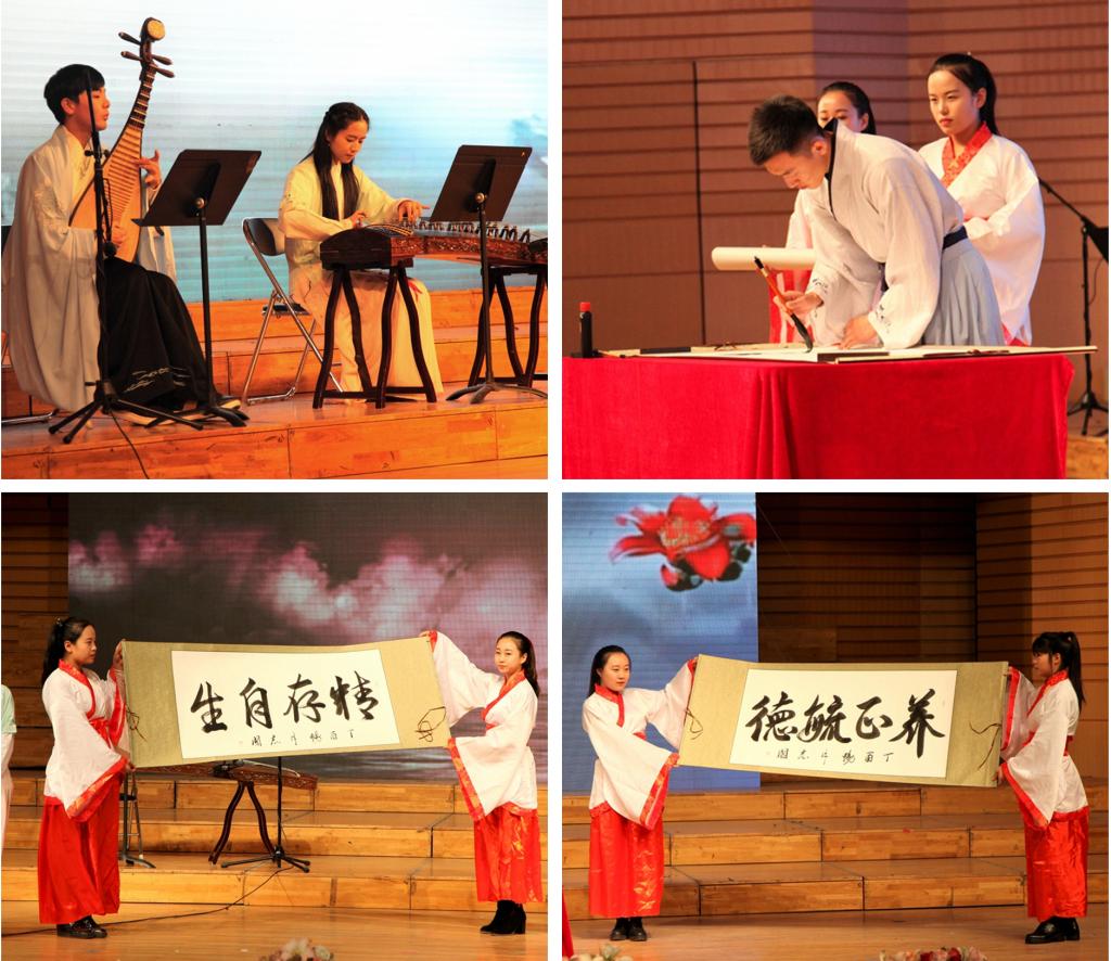 灯光聚集,柔声吟唱,古老昆曲萦绕在我们耳旁;行草隶篆,挥洒自如,翰墨瑰宝书写万世飘香。古乐与书法表演《春江花月夜》,韵律虽快却又令人感到宁静,令听众如醉如痴,书法表演伴随音乐缓缓而行,校训“养正毓德,精存自生”八个字跃然纸上。