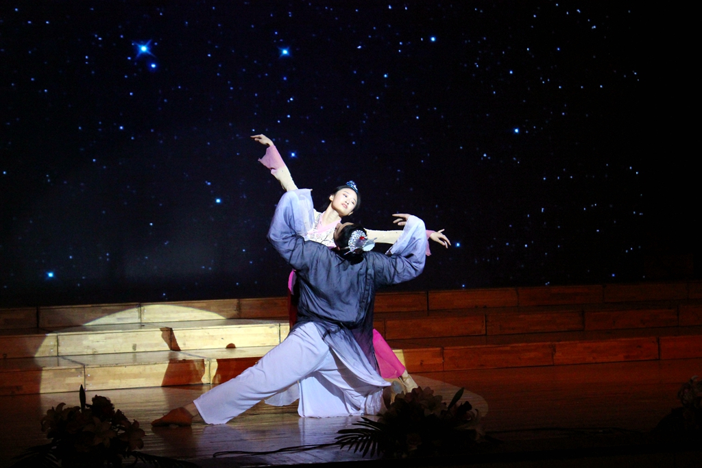 俊秀嫦娥舒广袖,薪火眷眷汗魂舞;形如轻云之闭月,舞如流风之回雪。双人舞《洛神赋》,演绎出一种柔情唯美的风格。舞者们舞姿优美,身姿曼妙,其动情投入的表演使现场气氛活跃起来。