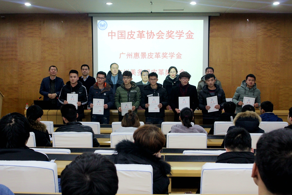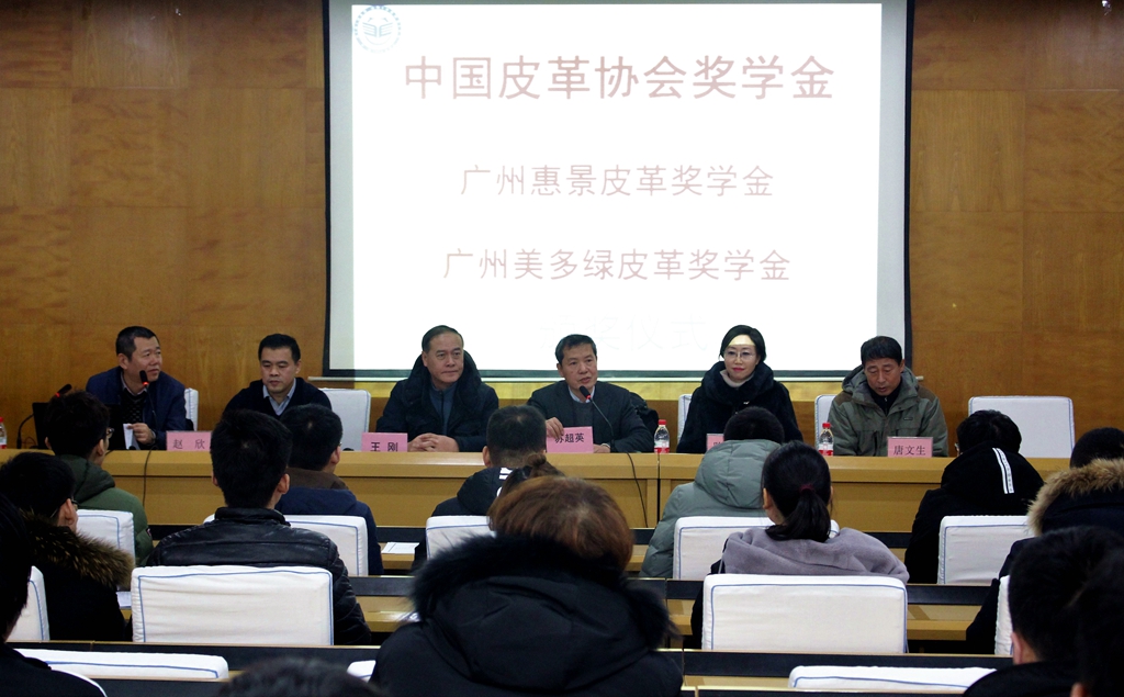 12月20日下午,2017年度中国皮革协会、惠景皮革奖学金、美多绿皮革奖学金颁奖仪式在我校西区主楼七楼学术报告厅举行。中国皮革协会名誉理事长苏超英、我校副校长王刚出席活动,轻工与纺织学院党委书记陈晓军、院长赵欣、副书记副院长唐文生、副院长宋秘钊、全体获奖学生以及2015级、2016级皮革专业90余名学生参加了本次活动。颁奖仪式由赵欣主持。