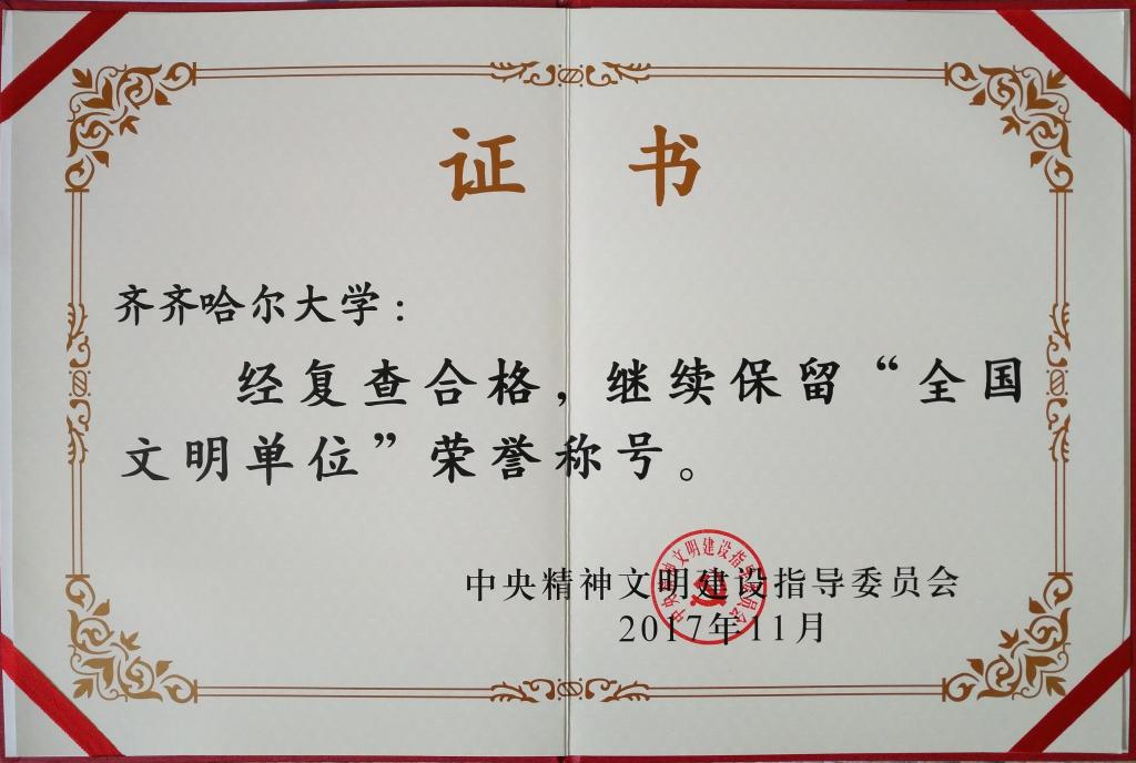 近日,全国精神文明建设表彰大会在北京举行,会议印发《关于复查确认继续保留荣誉称号的全国文明城市、文明村镇、文明单位的通报》,明确继续保留4661个单位全国文明单位荣誉称号,齐齐哈尔大学名列其中。我校自2011年被评为全国文明单位,七年来一直保持此项殊荣。