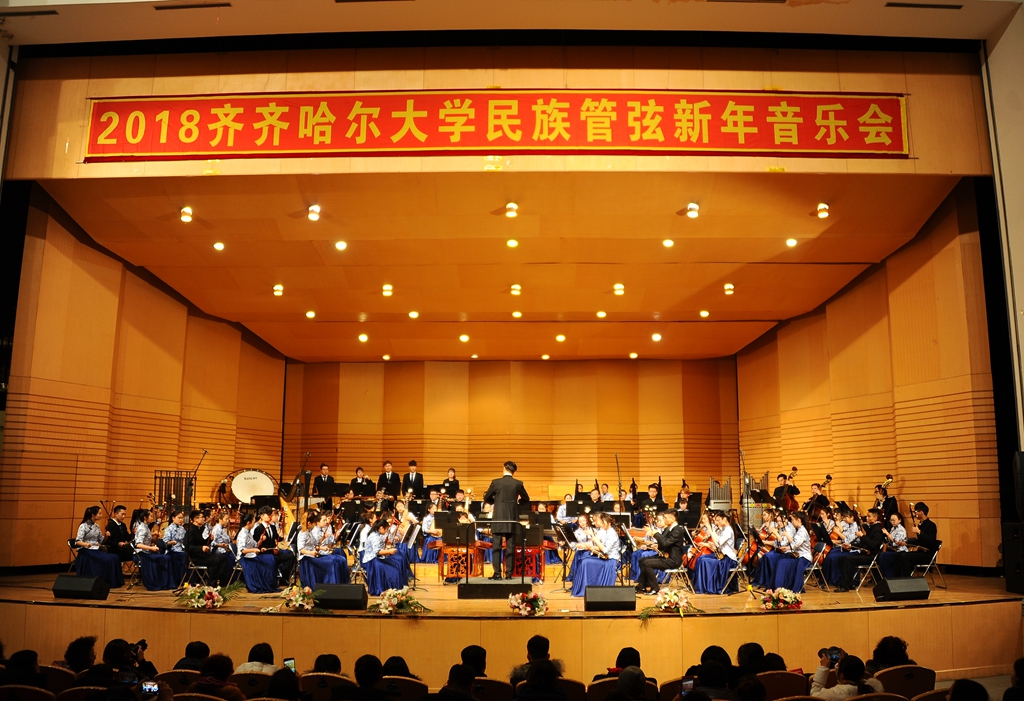 12月27日晚,2018年齐齐哈尔大学民族管弦乐新年音乐会在学校音乐厅隆重举办。校领导兰景力、马立群、齐宏伟、李英杰、吕厚均出席晚会,社会各界音乐爱好者和我校师生等700余名观众共同观看了音乐会。我校新闻中心还通过今日头条平台进行了网络视频直播,全国各地校友通过网络观看了本次音乐会。