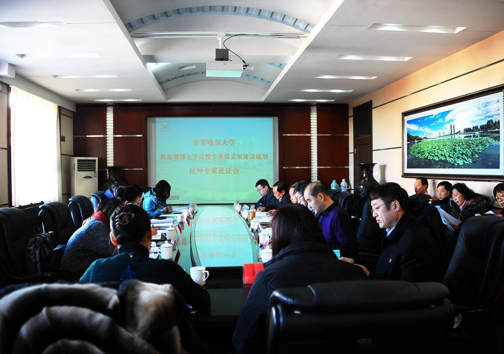 2017年12月27日下午,学校在办公楼504会议室召开拟新增博士学位授予单位立项建设规划校外专家论证会。邀请由哈尔滨师范大学博士生导师郭长虹教授任组长,东北石油大学博士生导师王尊策教授、黑龙江大学博士生导师秦川丽教授、哈尔滨商业大学博士生导师刘颖教授、东北林业大学博士生导师张智教授等专家组成的校外专家组来我校,就学校拟新增博士学位授予单位立项建设规划进行论证。