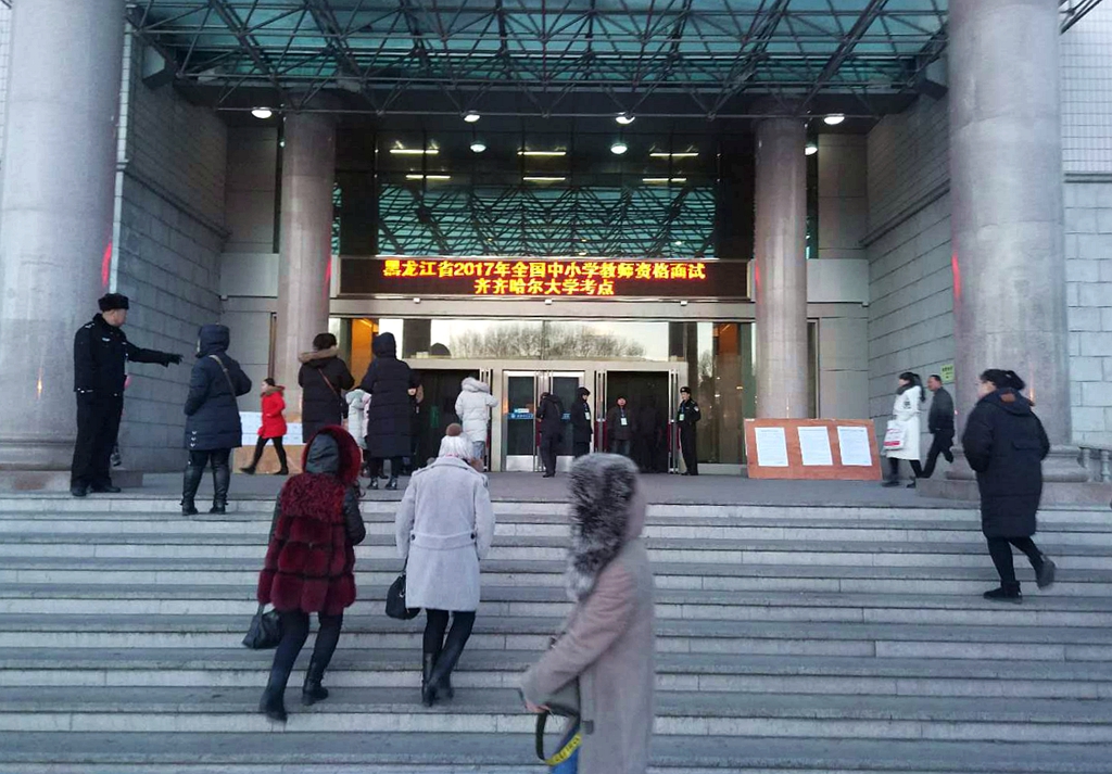 黑龙江省2017年全国中小学教师资格面试(齐齐哈尔大学考点)于2018年1月6日至7日在我校西区主楼进行。来自齐齐哈尔市、黑河市和大兴安岭地区的2472名考生参加了面试,本次面试副主考、我校副校长李英杰到考场检查指导工作。