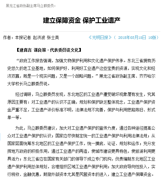 3月15日出版的《光明日报》在第10版“两会特刊”栏目中报道我校校长马立群委员关于“建立保障基金 保护工业遗产”的建言。