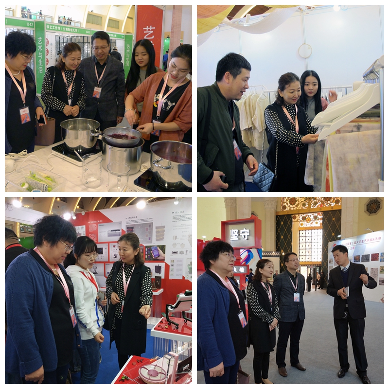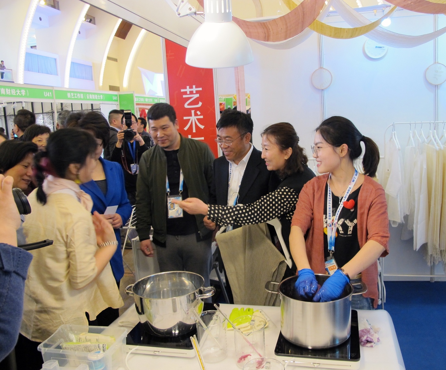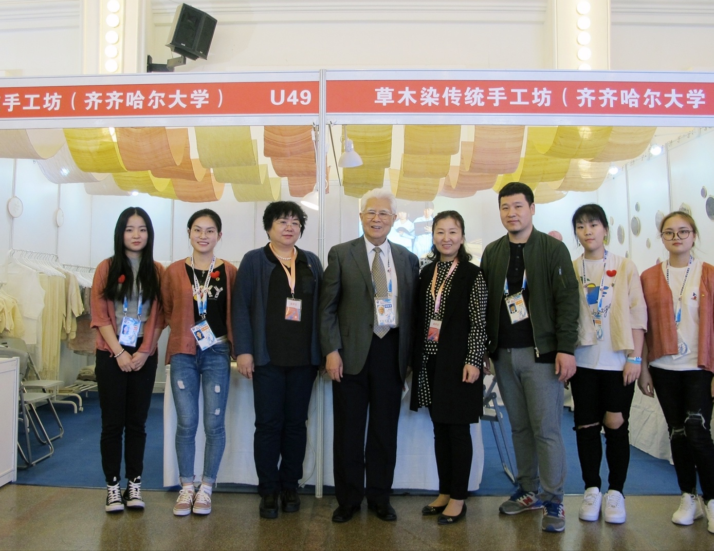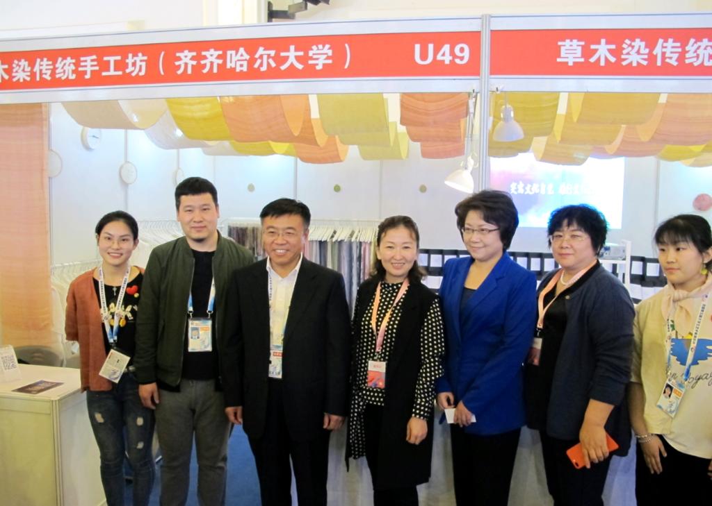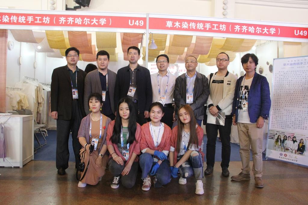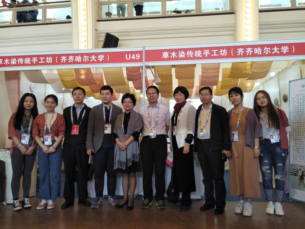 草木染传统工作坊是在“文化铸校”科学理念指导下我校大学生研发创新团队于2012年建立的。该团队主要由齐齐哈尔大学美术与艺术设计学院副院长范铁明教授、服装与服饰设计系赵志军副教授等组成,团队多年来以中国传统染色技艺为基础,利用现代科技手段进行技术改良和创新。通过建立大数据标准色卡数据库系统,对纺织品的颜色特征进行大胆的艺术创新实践。以全产业链整合连锁、生物酶高效生化色素萃取、大数据标准色卡数据库系统、分子生物学复合改性与表征、传统技艺现代仿真为创新点,在天然染料方面为消费者提供安全环保的纺织物。通过多年的技艺革新与大量的创新实践,目前已经形成了成熟的草木染技艺。2017年6月,草木染团队参加第十五届“挑战杯”黑龙江省大学生课外学术科技作品竞赛决赛,荣获一等奖、最具市场潜力奖、最佳人气作品奖三个奖项。2017年8月,该团队获得黑龙江省第五届大学生艺术展演(艺术工作坊)二等奖。同年5月和8月,草木染研发创新团队先后参加深圳文博会和第十二届黑龙江国际文化产业博览会,并顺利与企业签约进行全产业链合作。此次借助大艺展的平台,我校的草木染传统手工坊进一步走出黑龙江省,走向了全国,让更多的人熟悉和喜爱,所有参演师生都充满欣喜,倍感振奋。而欣喜与振奋之余,通过与全国各参展单位的交流,参演师生有了更多更深的思考,就是在新时代如何将草木染的成果更快更好地与现实生活紧密结合,不断满足日益增长的美好生活需要。更新发展理念,开拓审美视野,增长技艺见识,扩大友好交流,此次大艺展使齐齐哈尔大学参展师生收获颇丰。
