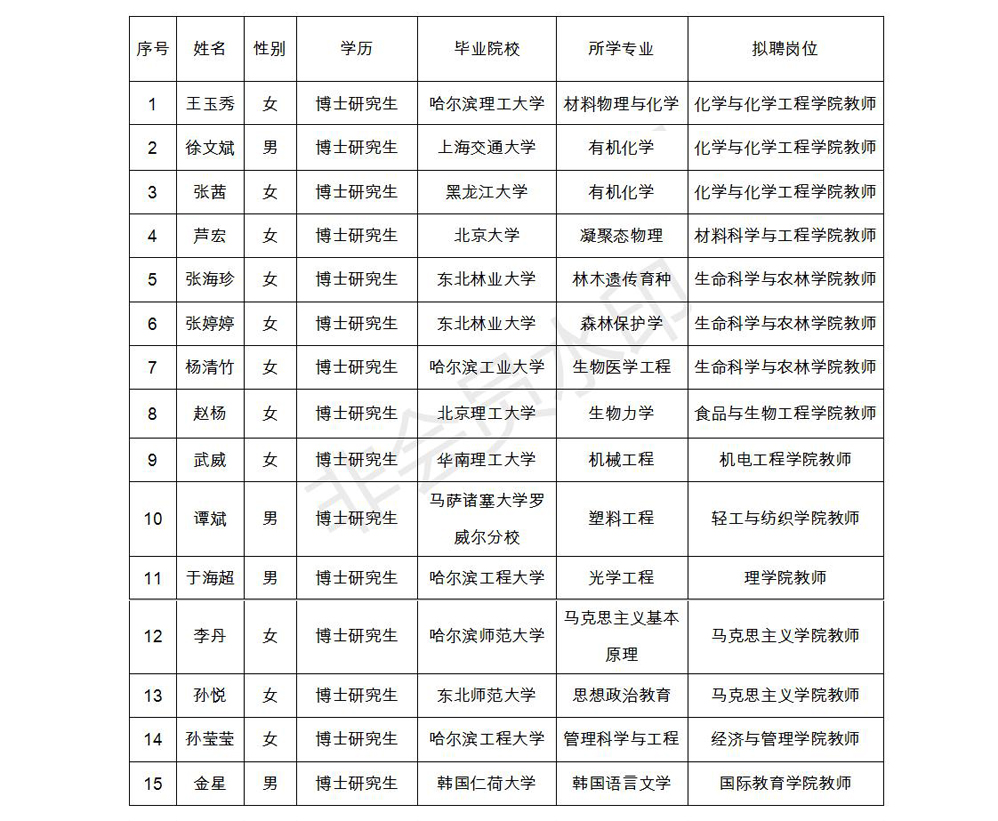 按照《黑龙江省事业单位公开招聘工作人员实施细则》的规定,根据《齐齐哈尔大学2020年上半年公开招聘人员公告》明确的原则、程序和方法,现将拟聘用人员予以公示。如对公示人员有异议,可在公示期内反映,反映情况和问题必须实事求是,应签署或告知真实姓名、工作单位和联系方式;对线索不清的匿名信和匿名电话,公示期间不予受理。