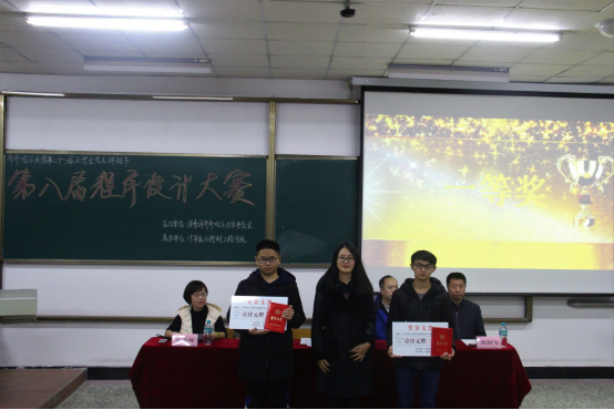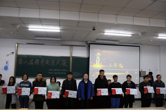 选手们以小组为单位应用计算机解决生活中的实际问题。所有参赛人员可以选择C、C++或Java编程语言并自行配置好编程环境。每组在120分钟内编写程序,解决考官提出的5个问题,并提交到平台上。比赛结束后由评判系统给出比赛排名。郭媛为荣获一等奖的计本175刘乙阳、计本177马杰两名学生颁奖。张宏烈为荣获二等奖的软件162李慧颖、网络161冯一凡、计本174麻树宏、计本181曾亭锋、计本188肖雄亓等六名颁奖。张春华为荣获三等奖的计本1810肖磊、计本189任秀心、计本163张清、计本173石成龙、计本174史春雨、计本176史国庆、计本184陈明辉、计本187肖江、软件162陆云凤、计本186王嘉桢等十名学生颁奖。最后,郭媛致辞,对于取得奖项的学生进行了鼓励与肯定,她指出,本次比赛一方面检验了我校学生程序设计水平,另一方面也达到了“以赛促学”的目的,同时也增强了学生的学习兴趣。