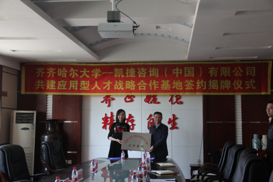 签约仪式上,李英杰与李嘉慧代表校企双方在协议文本上签字并为齐齐哈尔大学——凯捷咨询(中国)有限公司共建应用型人才战略合作基地揭牌。